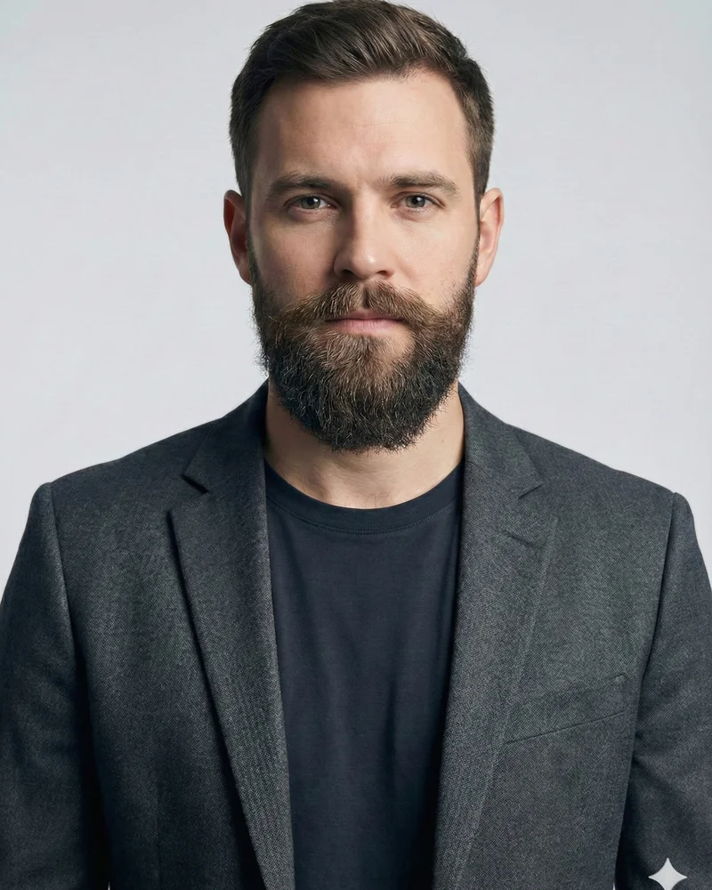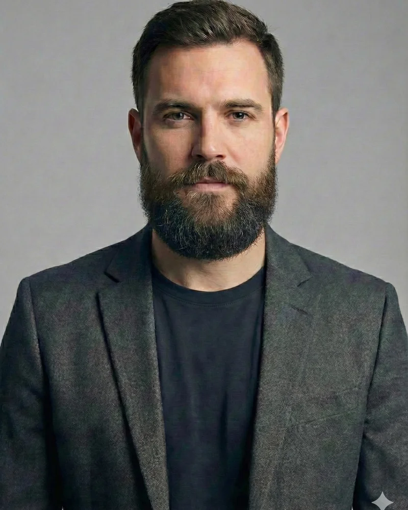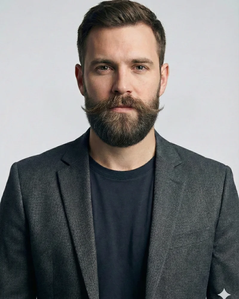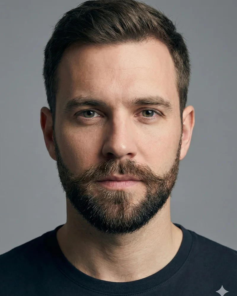 The anchor beard traces along the jawline with a pointed chin beard and mustache, resembling a ship's anchor. Perfect for defining the jawline without sideburns.
